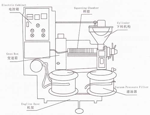 This combined oil expeller mostly composed by four parts: feeder, press chamber, electrical control and vacuum filter drum. The heating system is inside press cage. The filtering drum is vacuum filter with sight glass. The oil sight glass can help user to control the speed of oil clearing process. Integrated oil press machines are ideal choice for those who do business in the country market or who run a small or medium oil mill.